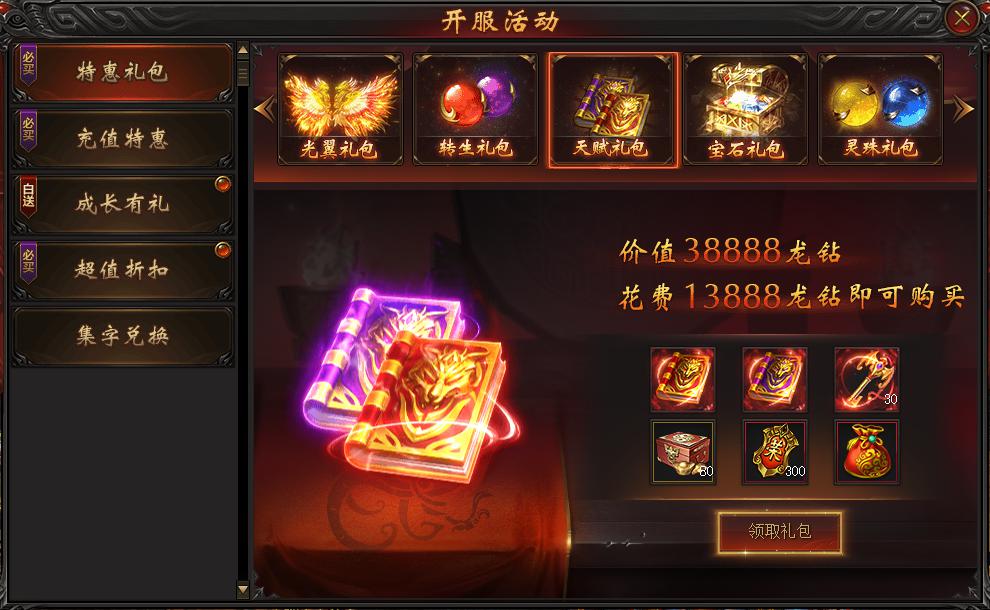说明:开服第五天即可购买。购买礼包可得超稀有天赋书,天赋多1点,属性暴涨一大截!还有大量元宝荣誉,助力提升战力!
