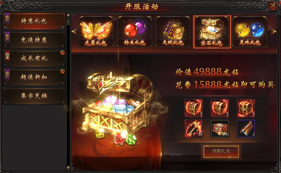 说明:开服第五天即可购买。购买礼包可得高等级宝石及大量元宝,助力提升战力迅速升级!