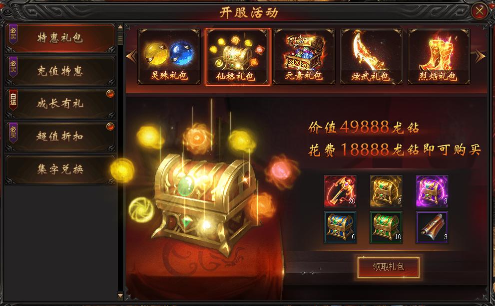 说明:开服第七天即可购买。购买礼包即可获得海量仙格,助您快速提升战力!