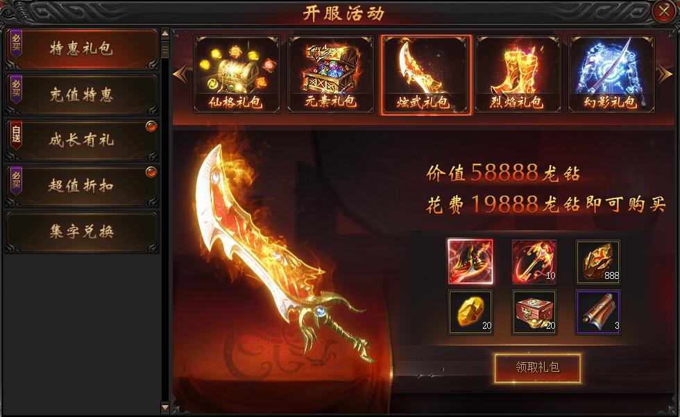 说明:开服第一天即可购买。购买礼包可得超强“屠龙”之刃,极品武器在手,PK何须第二刀!