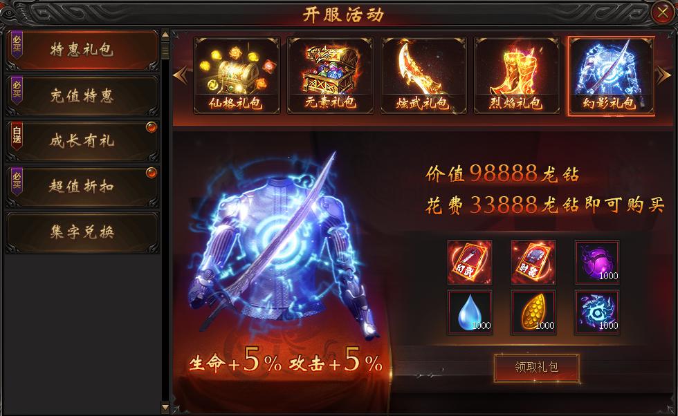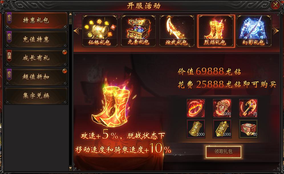 说明:开服第三天即可购买。购买可得“炼狱红莲”足迹特效,生命获得大量提升,攻速猛增5%,脱战状态更可增加10%移动速度!