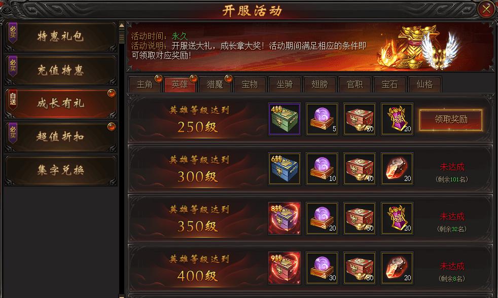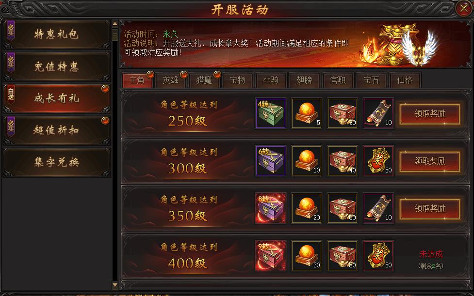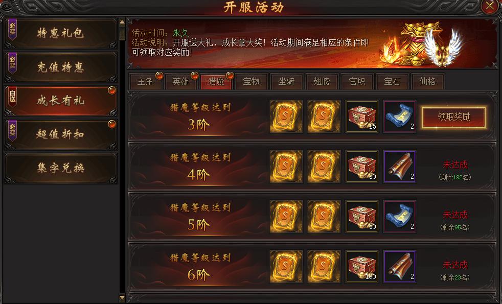 说明:活动期间猎魔等阶满足条件即可领取大量奖励