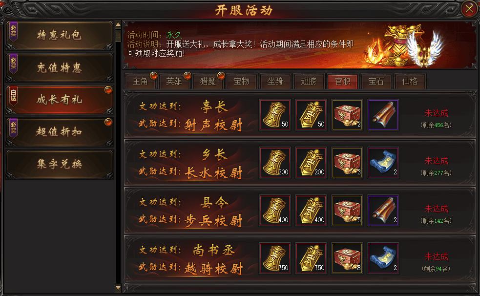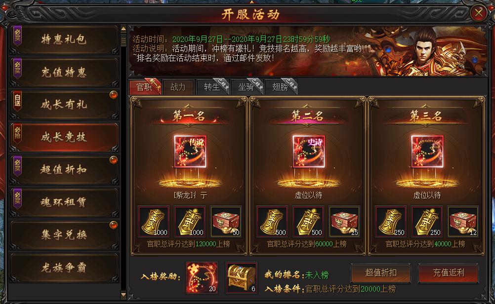 说明:开服第四天,活动期间官职总评分满足条件即可上榜,最终排名越高奖励越丰富