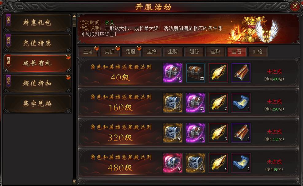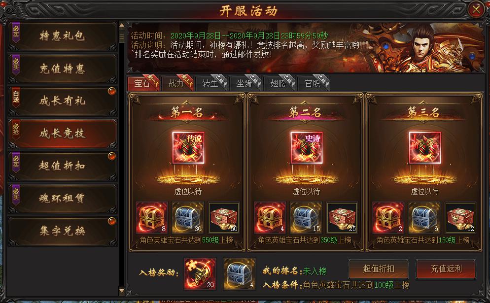 说明:开服第五天,活动期间角色英雄宝石总等级满足条件即可上榜,最终排名越高奖励越丰富