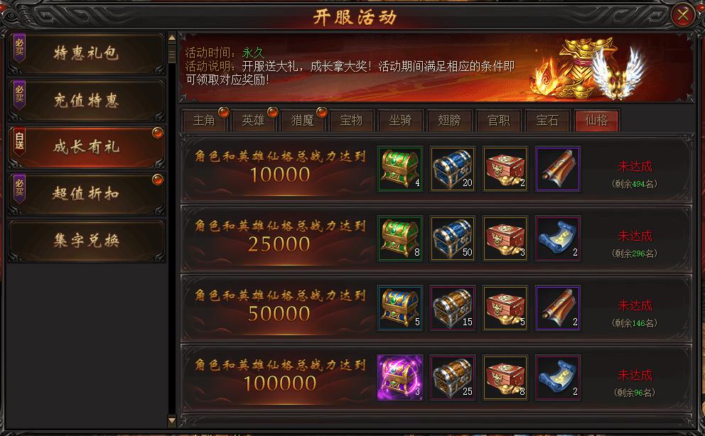 说明:活动期间仙格等阶满足条件即可领取大量奖励