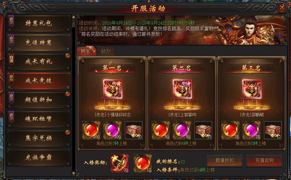说明:开服第一天,角色转生等级满足条件即可上榜,最终排名越高奖励越丰富