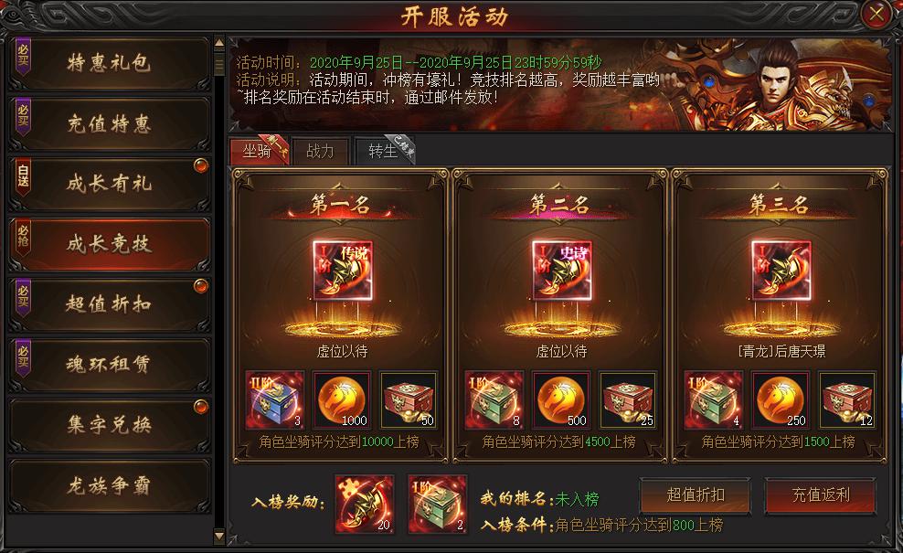 说明:开服第二天,角色坐骑评分满足条件即可上榜,最终排名越高奖励越丰富