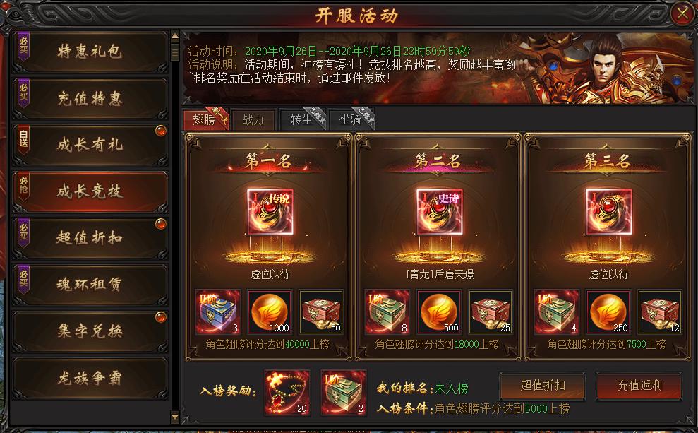 说明:开服第三天,角色翅膀评分满足条件即可上榜,最终排名越高奖励越丰富