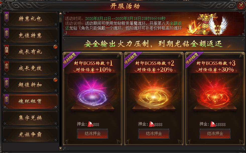 活动说明:活动期间可用龙钻租赁屠魔魂环,开服第八天全额返还龙钻(只可租赁其中一个,低价魂环可补差价转租高阶魂环),提升对怪伤害及免伤,提升打宝效率