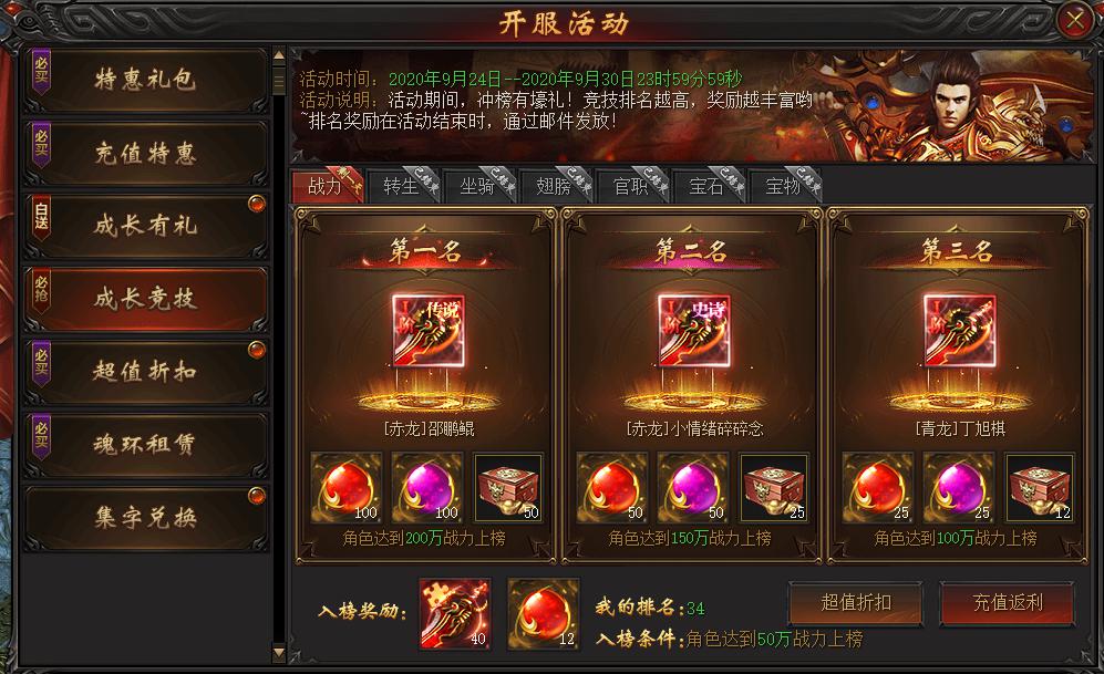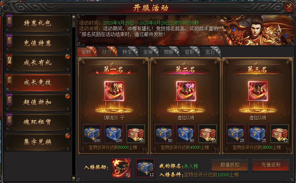 说明:开服第六天,宝物总评分满足条件即可上榜,最终排名越高奖励越丰富